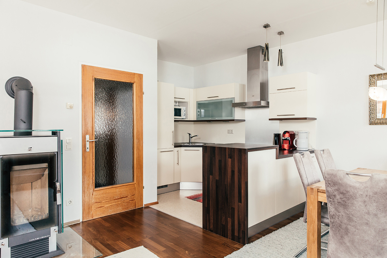 - Fully equipped kitchen with stove, oven, microwave, refrigerator and freezer, dishes, coffee and espresso machine